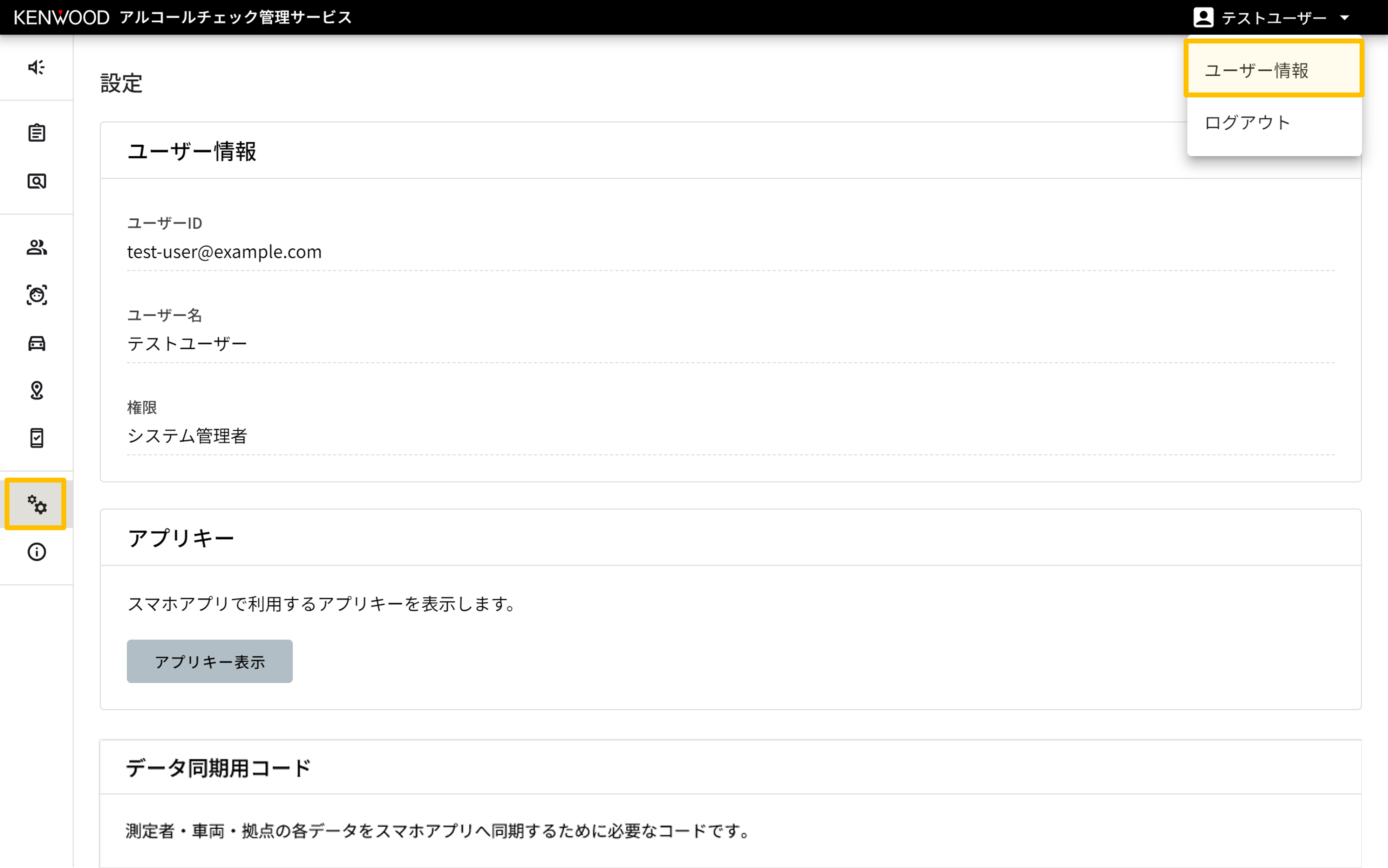 このページでは、スマートフォンアプリと測定者・車両・拠点情報を同期するために必要となるデータ同期用コードを確認する方法について説明します。